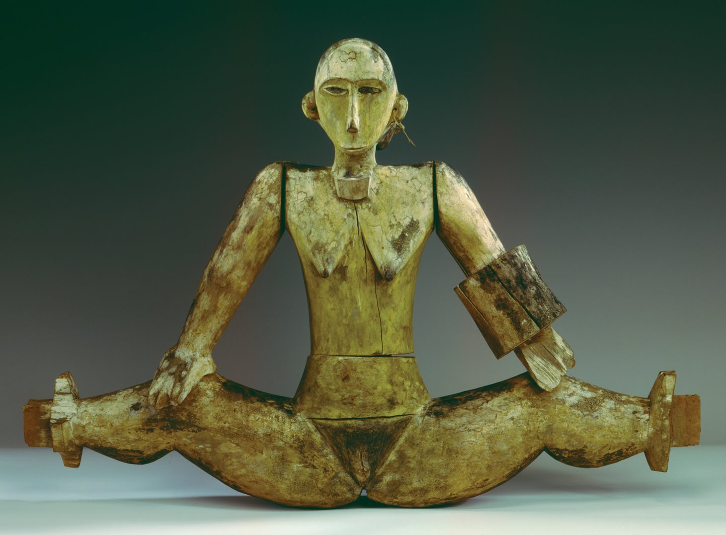 In the Belau culture of Micronesia, Dilukai were common images of splayed female figures. The figures served as symbols of fertility and protection. They commonly surmounted the main entrances into the village’s men’s ceremonial houses. Although the men held the power in the Belau culture, women did have important symbolic and societal functions. Dilukai were created to protect the men’s houses—demonstrative of the power of women in Belau culture. The men created rituals--excluding women and taking place in the men’s ceremonial houses--to counteract the power of women—especially their power to procreate.